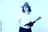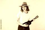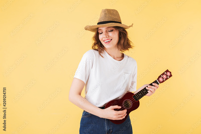 Portrait of smiling lady in straw hat standing with little guitar and happily playing on it on over pink background