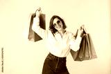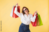 Portrait of pretty cheerful lady in sunglasses standing with colorful shopping bags in hands on over pink background. Young woman standing in white shirt and denim shorts