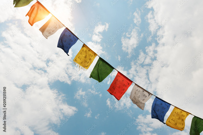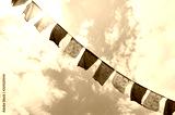 Tibetan flags with mantra on sky background