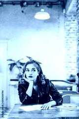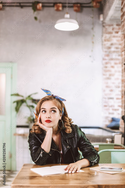Pretty lady in leather jacket sitting at the table with notebook and pencil and dreamily looking aside while spending time in cafe