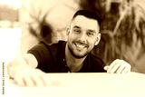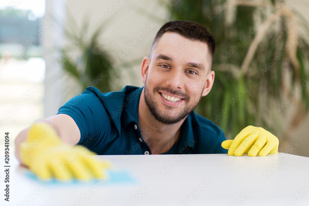 household, cleaning and people concept - smiling man wiping table with cloth at home