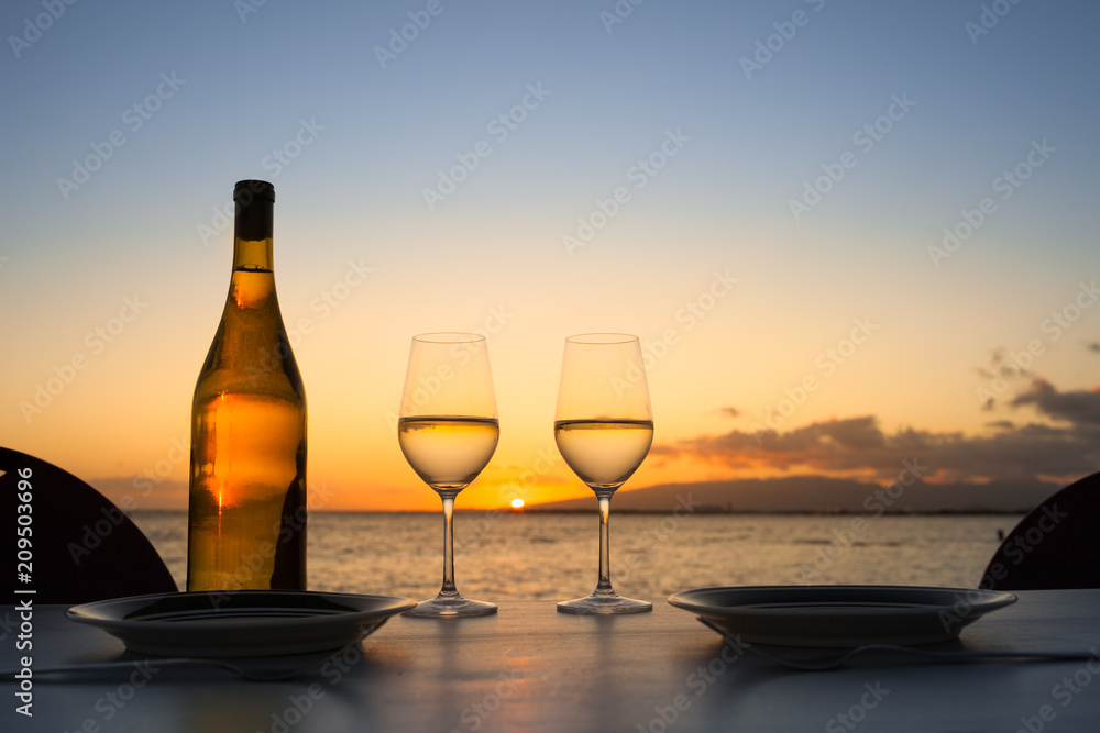 Romantic dinner table setting by the sea.