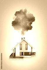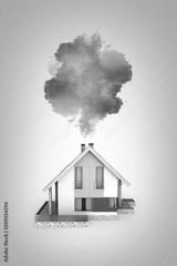 Ecology concept Illustration of pollution by exhaust gases Modern house producing a lot of smoke isolated on blue gradient background 3d render