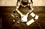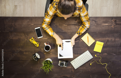 Woman holding tablet knolling overhead view
