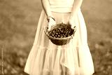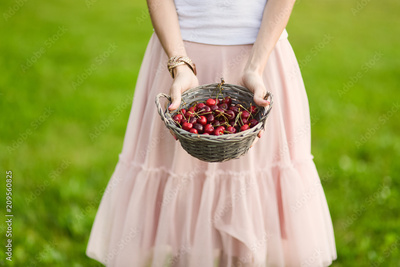 close-up portrait of a beautiful romantic brunette girl with a basket of cherries in a green garden