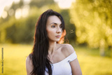 close-up portrait of a beautiful cute girl in a romantic brunette skirt with in a green garden posing and smiling