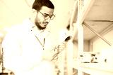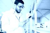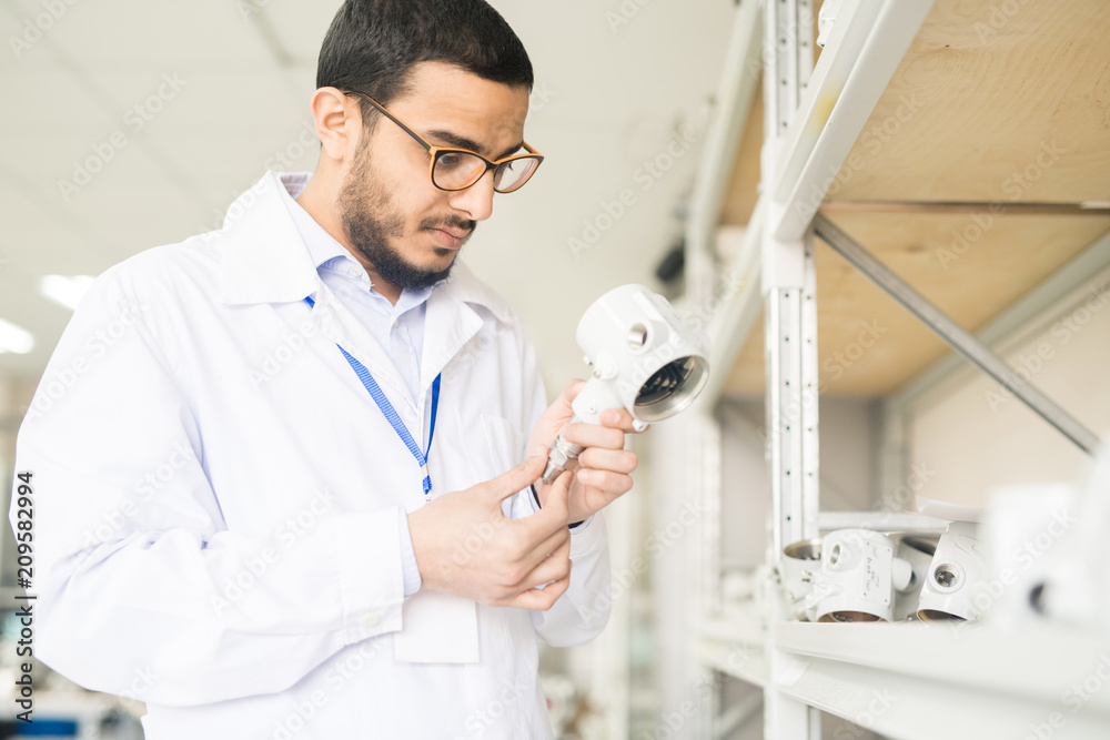 Waist-u portrait of handsome Arabian engineer wearing eyeglasses and lab coat examining quality of pressure sensor while standing at spacious warehouse of modern plant