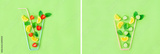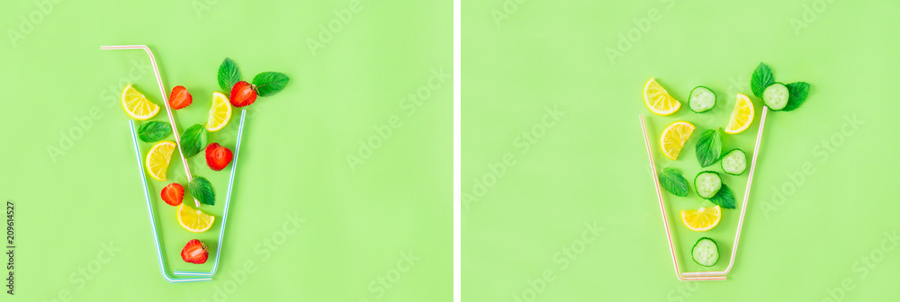 Creative layout. Strawberry and cucumber lemonade ingredients, lemon, mint falling in glass made with coctail straws on green background. Summer drinks. Duplex. Minimal food concept. Copy space.