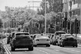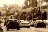 cars stopped at a red traffic light signal in the summer hot midday with a shallow depth of field