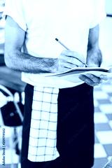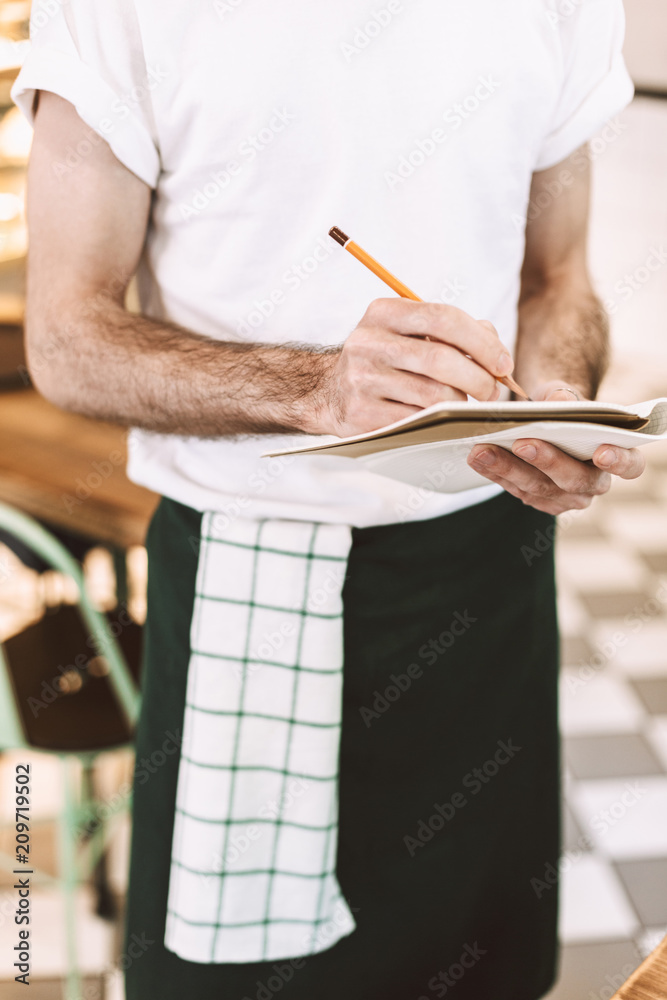 Close up photo of waiter standing with pencil and writing order in notebook in cafe