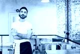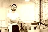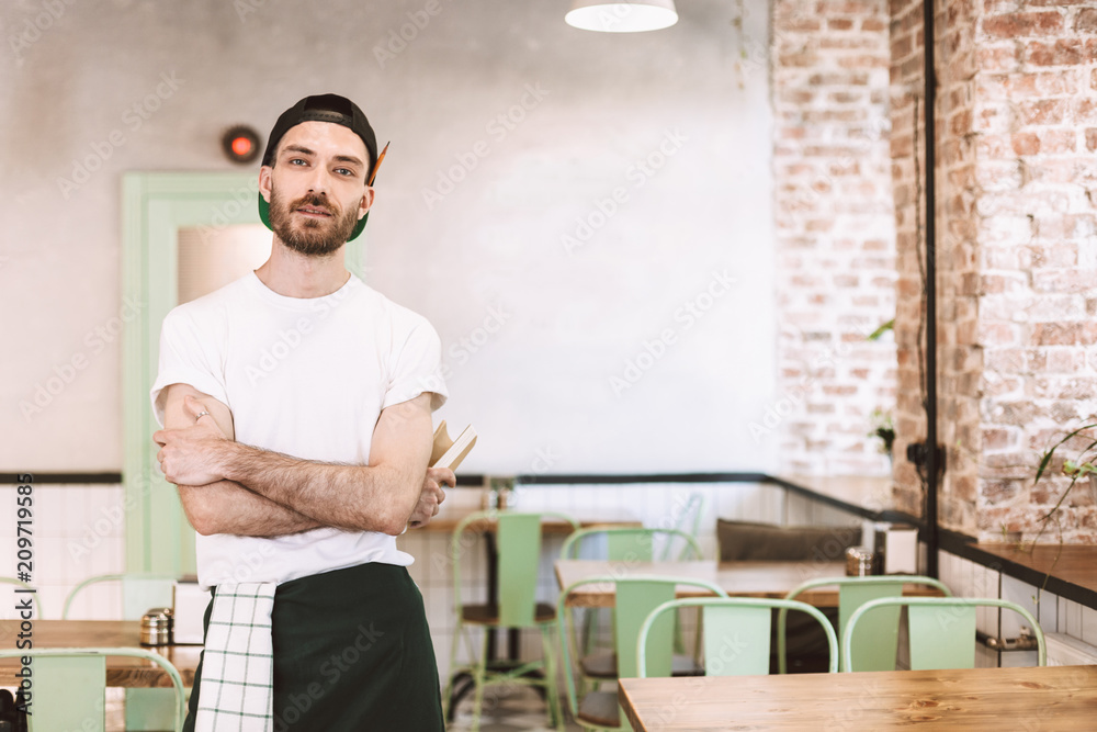 Young man in black cap,white t-shirt and apron standing and dreamily looking in camera while working in cafe