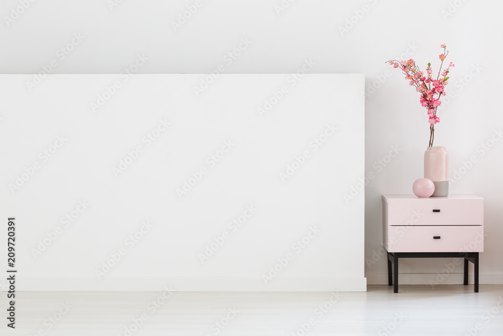 Pink flowers on cabinet next to white wall with copy space in living room interior. Real photo