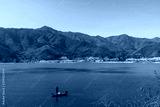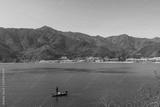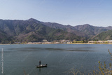Lone fisherman on a boat on Lake Kawaguchi, Yamanashi Prefecture, Japan
