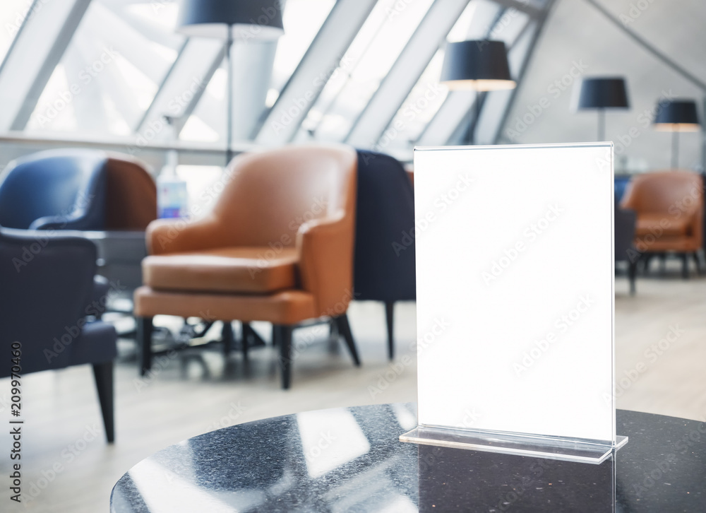 Mock up Blank Menu frame on Table Interior Restaurant cafe with seats
