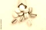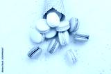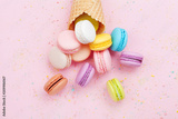 Sweet waffle cone with macaron or macaroon on pink pastel background top view. Flat lay composition.