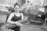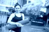 young Asian attractive woman holding purple yoga mat near swimming pool, pilates workout and healthy lifestyle concepts