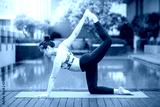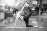 Young Asian attractive woman doing yoga exercise near swimming pool. Pilates workout and healthy lifestyle concepts. International yoga day