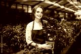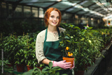 Beautiful smiling florist in apron and pink gloves standing with little mandarin tree in pot and joyfully looking in camera in greenhouse