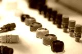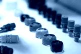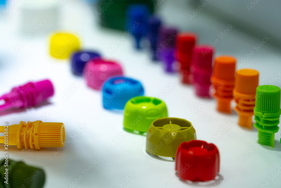 Selective focus on different type of plastic bottle cap of food and drink product. Green, yellow, red, pink, orange, blue, and purple cap closure on white table. Modern design plastic bottle cap.