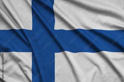 Finland flag is depicted on a sports cloth fabric with many folds. Sport team banner