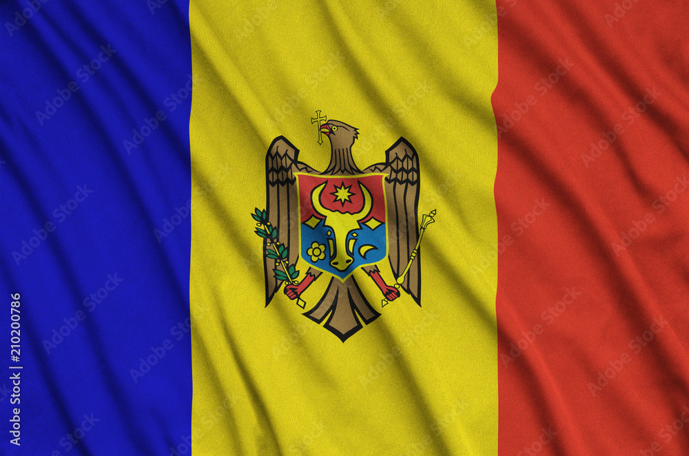 Moldova flag is depicted on a sports cloth fabric with many folds. Sport team banner