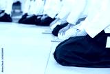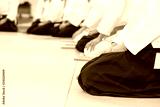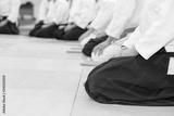 People in kimono sitting on tatami on martial arts weapon training