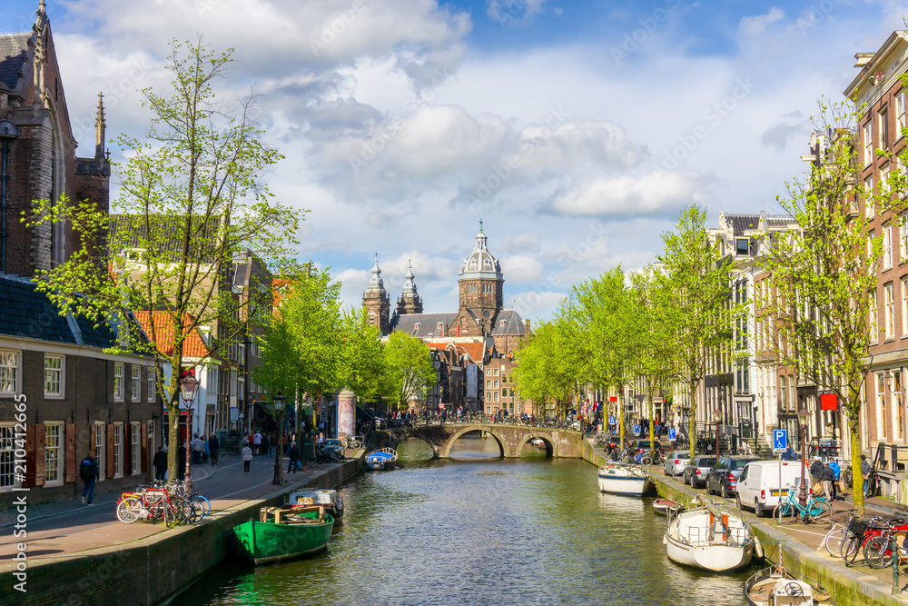 Colorful traditional old buildings in sunshine day at Amsterdam, Netherlands