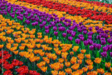 Beautiful tulips fields in the Netherlands in spring under a sunrise sky, Amsterdam, Netherlands