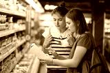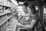 Two pretty female sisters go shopping together, stands in grocer`s shop, select fresh milk in paper container, read label, carry rucksacks, have serious expressions. People and commerce concept