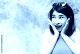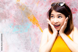 Gorgeous woman is looking at copy space. Charming beautiful woman acts like a surprise, happy, shock, admire or wow some goods, product, service or something with copy space, colorful wall background