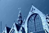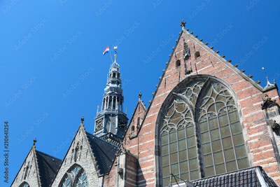Old Church Oude Kerk the oldest building in De Wallen Amsterdam, Netherlands against blue sky.