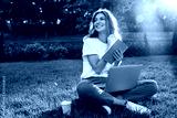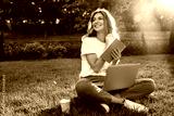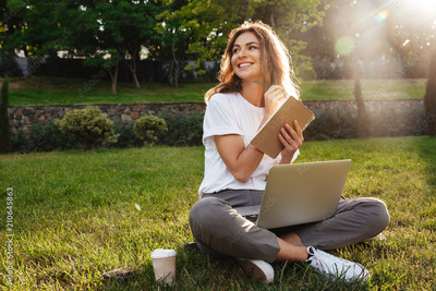 Portrait of beautiful smiling woman sitting on green grass in park with legs crossed during summer day, and writing notes with pen while using laptop