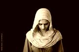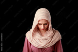 portrait of pretty girl wearing a pink headscarf. black studio background.