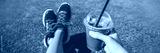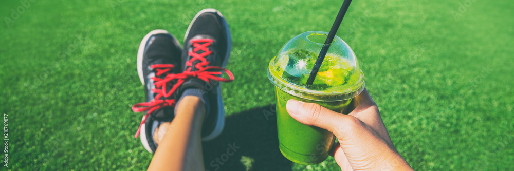 Healthy green smoothie detox juice woman holding drink shower running shoes in food selfie photo. Sport active lifestyle banner panorama.