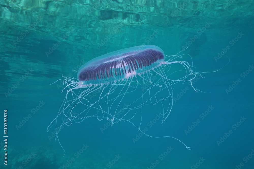A many-ribbed jellyfish Aequorea forskalea underwater in the Mediterranean sea, Cote d'Azur, France