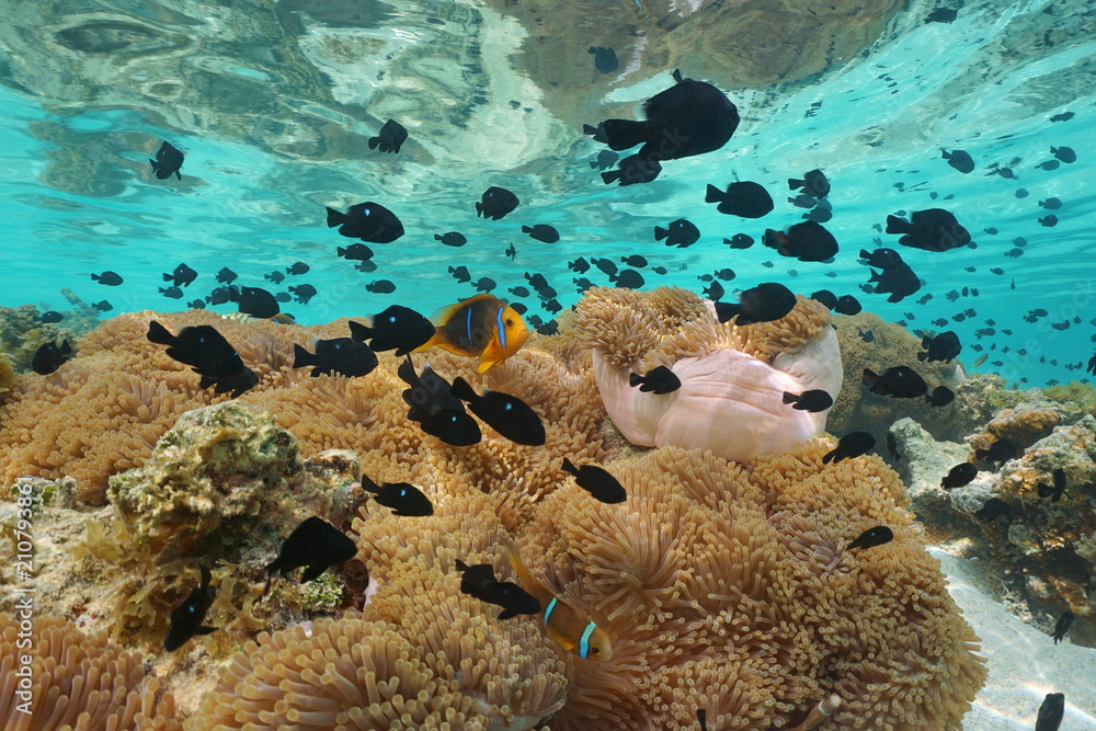 Underwater a school of tropical fish ( mostly damselfish with some clownfish ) and sea anemones, lagoon of Huahine island, Pacific ocean, French Polynesia