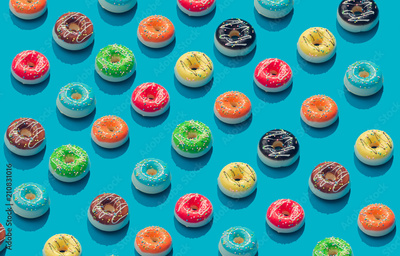 Creative pattern of colorful donuts on pastel blue background. Minimal food concept. Isometric.