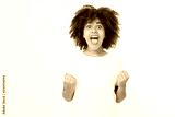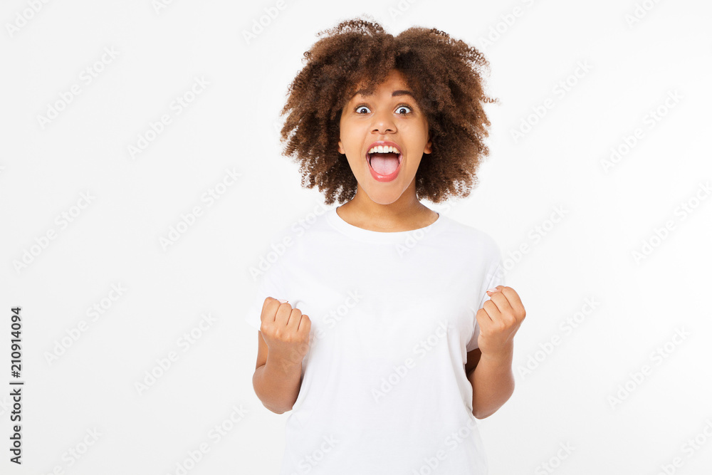 Happy young dark skin woman isolated on white background in tshirt clothes. Copy space. Mock up. White template blank summer t shirt. Curly hair girl