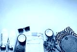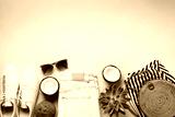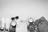 Woman summer travel clothes travel on blue background. Jeans, sneakers, bamboo bag, sunglasses, coconut and succulent. Top view, flat lay. Fashion, capsule wardrobe concept. Creative flat lay.