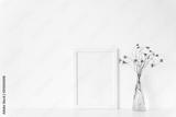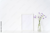 White portrait frame mockup with wild flowers in vase near white wall. Empty frame mock up for presentation design. Template framing for modern art.