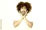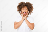 Happy suprised face. Young dark skin woman isolated on white background in tshirt clothes. Copy space. Mock up. White template blank summer t shirt. Curly hair girl