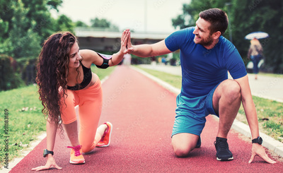 Jogging. Young couple enjoys together in the morning training outdoor. Sport, fitness, recreation concept