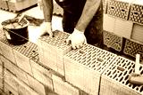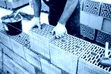 Industrial worker, bricklayer using tools and bricks for building house. Mason details