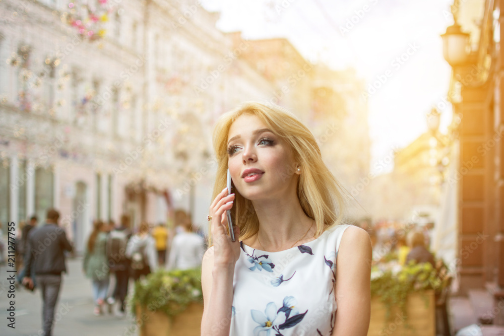 Portrait of beautiful young blonde woman talking on mobile phone on the city street.
