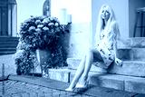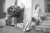 Attractive blonde young woman in white dress sitting on staircase outdoors.