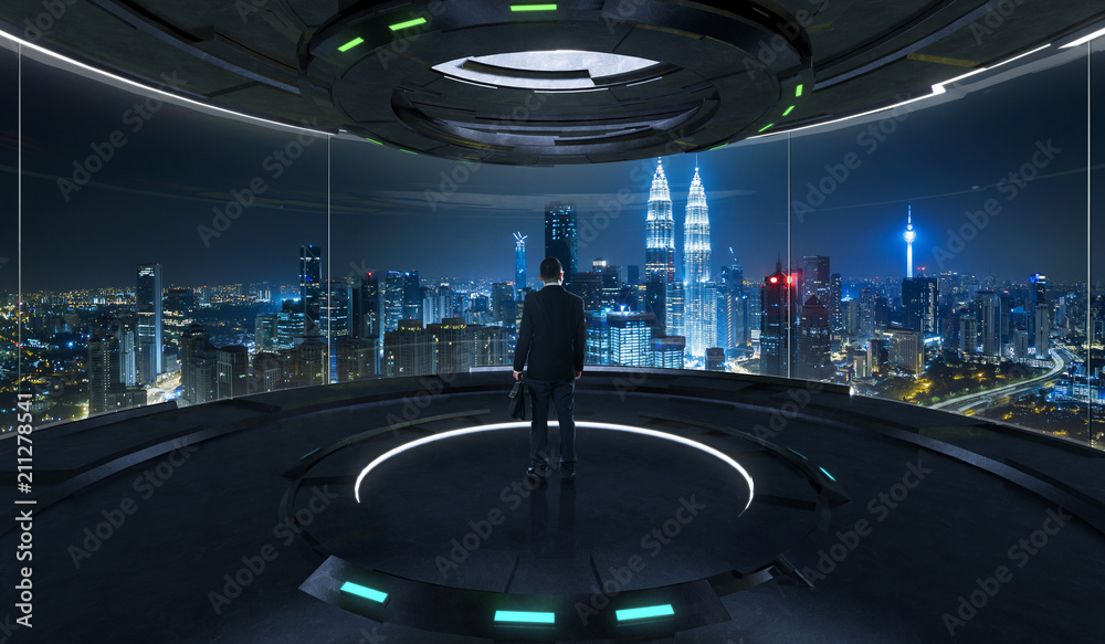 Young businessman looks out city outside from high-tech control room . Mixed media .