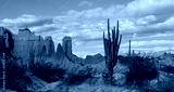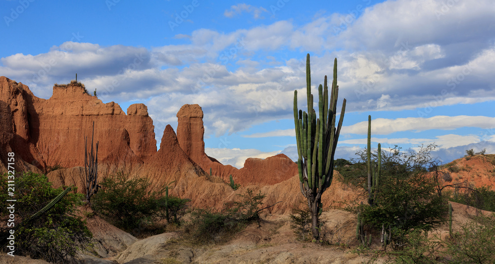 Desierto de la Tatacoa - Tatacoa Desert in Neiva Colombia. Panoramic view with Cactus, Desert Landscape and Blue Sky/White Clouds