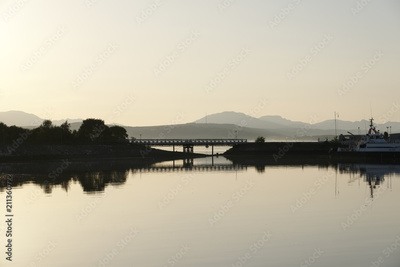 Tranquil sunset river Clyde bridge reflection to shipbuilding harbour harbor peaceful summer evening gourock greenock Scotland uk