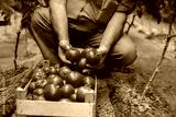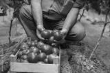 The farmer in the greenhouse holds a crates of fresh tomatoes