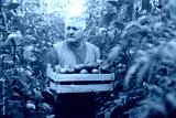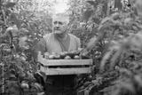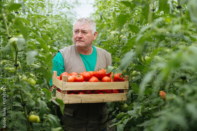 The farmer in the greenhouse holds a crates of fresh tomatoes
